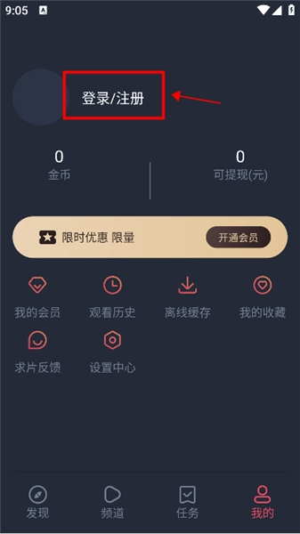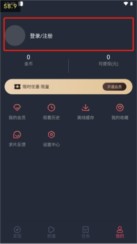 2、进入之后我们首先在【我的】页面,点击登录/注册,才能观看影片。