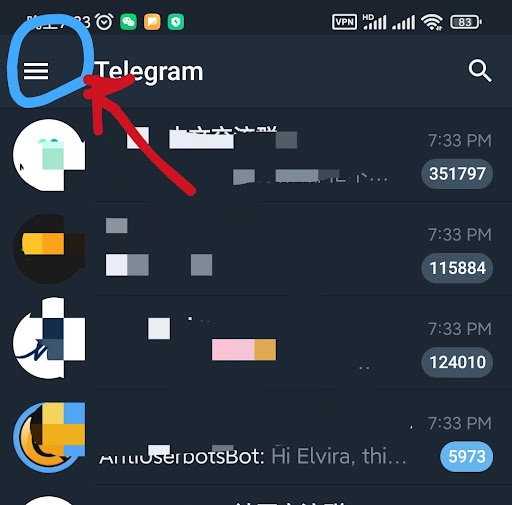 打开 Telegram 应用并点击左上角的三横线(菜单)按钮。