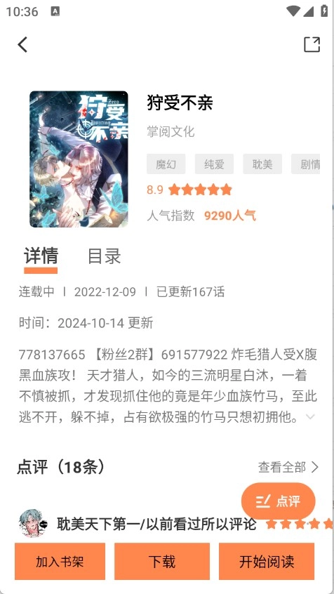 4、点击想要观看的漫画,进入详情页面,在此页面可将漫画添加至书架,并开始阅读。