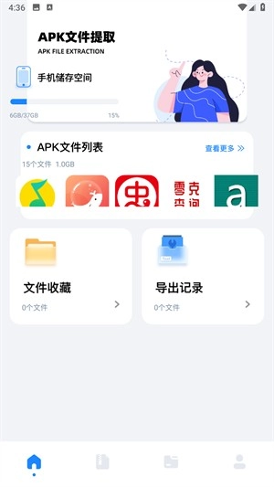 1、打开软件进入首页,有文件收藏和导出记录两个功能可以使用,点击上方查看更多。