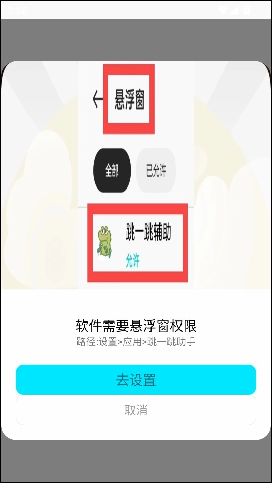 1、打开软件时,第一步便会要求我们进行悬浮窗权限设置操作,此时我们点击“去设置”。