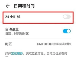 5、于【日期和时间】页面,点击开启【24小时制】右侧的开关,此操作意味着24小时制已被启用。