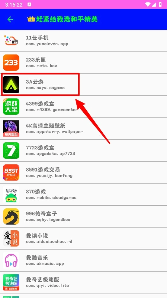 3、如图片所示,系统会自动识别手机里的全部应用,点击你想要测试的资源。