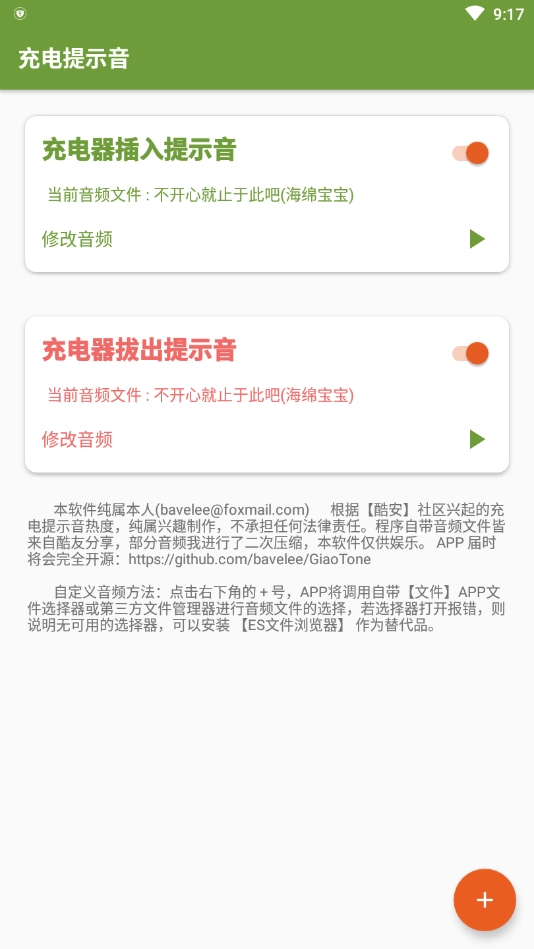 这款软件是很好用的,可以自定义修改插电音频路径,自定义修改拔电音频路径,找到要播放的音频放在你们的储存卡能找到的目录,或者通过QQ发送给自己选择从QQ接收目录选择音频,选中音频文件,记得软件给后台锁定电池优化白名单,以防被后台杀。