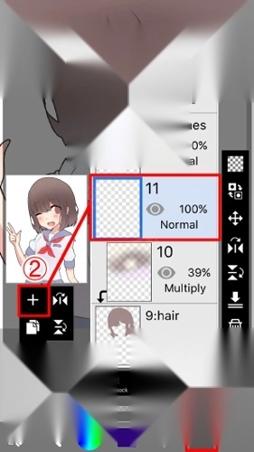 同样地,在“图层”窗口中点击加号按钮,为阴影添加图层,使其成为当前图层,将③混合模式设为“乘法”,最后转到步骤四开启剪切。此外,把画笔颜色改为黑色。