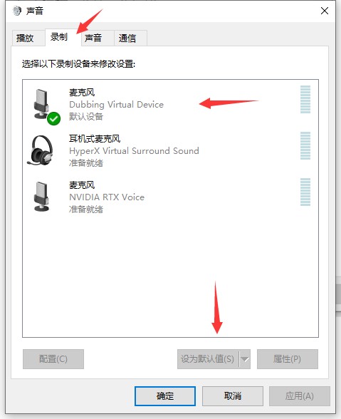 选择“录制”,选择\\"Dubbing Virtual Device(大饼AI变声器虚拟声卡)”,将其设为默认值