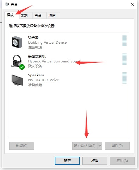 选择“播放”,选择自己的耳机,将其设为默认值