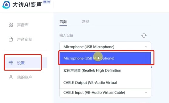 在大饼AI变声器中将输入/输出设备设置为耳机扬声器和耳机麦克风