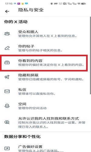 3、在\\"隐私与安全\\"页面中,点击\\"你能看到的内容\\"选项。