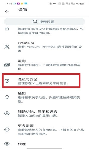 2、在\\"设置和隐私\\"页面之中找到\\"隐私与安全\\"后点击。