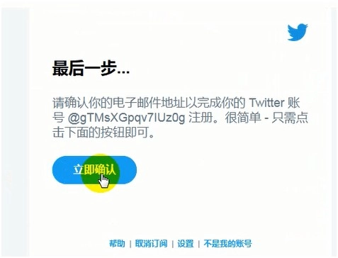 7、待所有信息填写完毕,Twitter 会向你最初预留的邮箱发送一封邮件。进入邮箱,点击邮件内的链接,账号即完成验证。