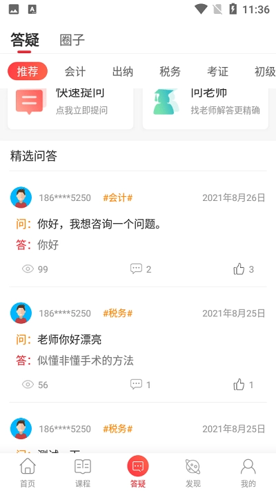 若您在学习或工作中碰到任何会计税务方面的问题,可前往“答疑”板块进行在线提问,届时各领域的资深财会老师会为您在线解答。此外,您还能在QQ群内向老师发问,会计教练会及时解决学员们的问题。