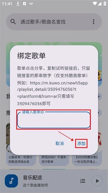 3. 打开酷我音乐平台,找到你想添加的歌单,点击分享。接着,复制分享链接中的数字,这个数字就是歌单id。把获取到的歌单id粘贴进来,然后点击【添加】按钮即可(此操作仅支持酷我音乐平台)。