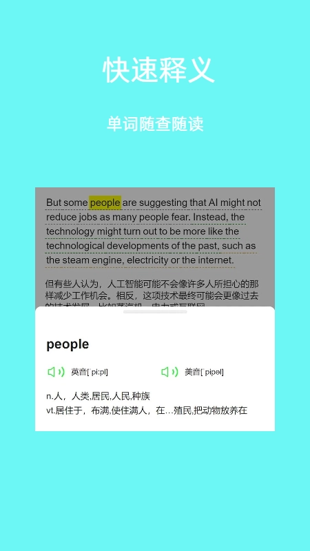 2. 在阅读时,若遇到不熟悉的生词,可点击查看其翻译、语法解析以及听力发音等内容。