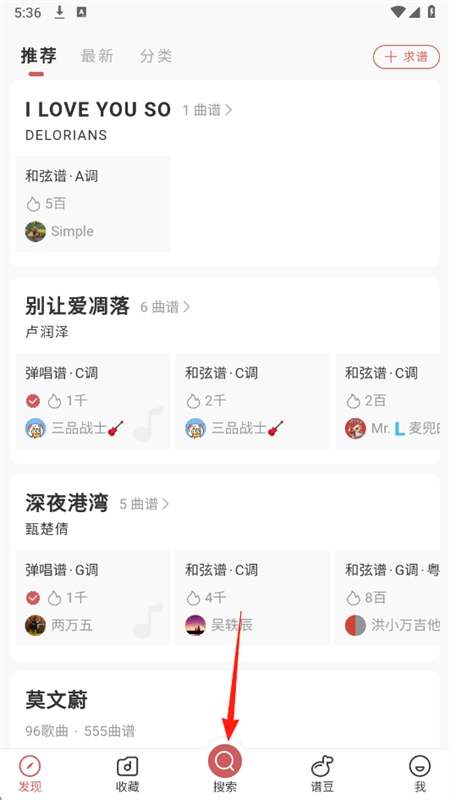 3、在发现页面,点击“曲谱”选项,进入乐谱库。