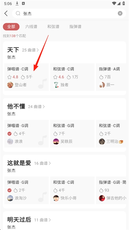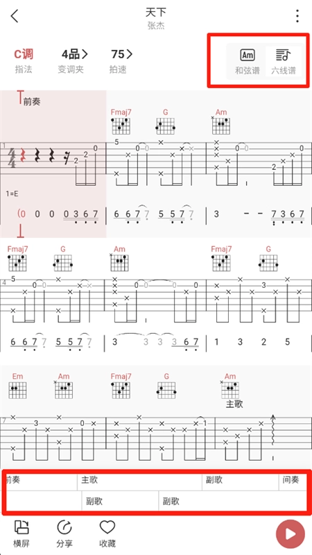 5、来到乐谱界面,在此界面上方能够切换显示和弦谱或者六线谱,而下方则可快速跳转至主歌、副歌等位置。
