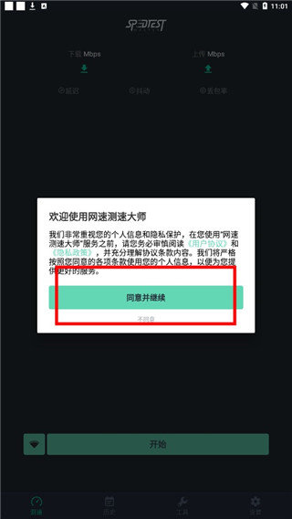 2、第二步,阅读用户协议和隐私政策,并同意网速测试大师继续。