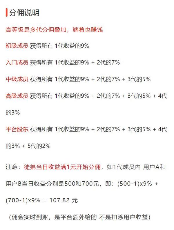 注意:徒弟当日收益达到0.2元便开始进行分佣。例如,若1代成员中有用户A和用户B,他们当日收益分别为500元与700元,那么分佣计算方式为:(500 - 0.2)×20% + (700 - 0.2)×20% = 239.6元 。
