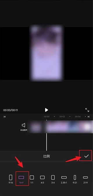 进入编辑界面后,向左滑动底部菜单,找到比例,点击进入,如图所示: