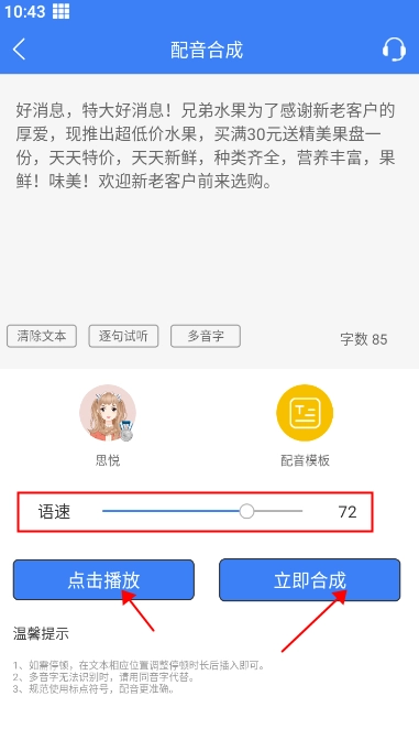 5、最后点击试听调整合适的语速,当你觉得满意后点击立即合成即可完成这段文字转语音了。