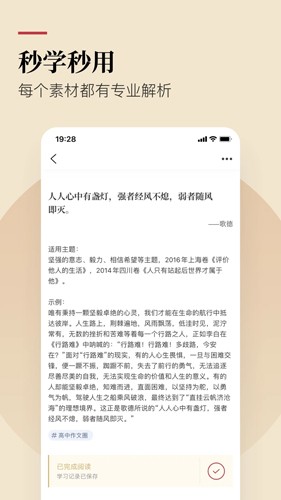 每一个素材,都提供了独家的用法解析和范例,让你看了下一次考试就能立刻用上。与纸条君一起,以一种简单美丽的方式,更高效地提高作文成绩。