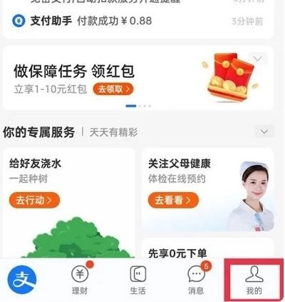 1、打开支付宝,点击右下角的【我的】;