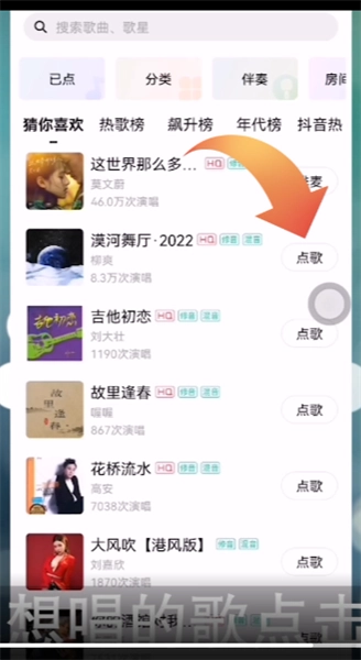 4.进入到点歌界面后,找到自己想唱的歌点击【点歌】即可上麦唱歌。
