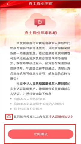 第三步:进入年审须知页面,认真研读相关内容,随后勾选“我已阅读并接受上述条款及《认证服务协议》”,接着点击“立即确认”,即可跳转至个人信息录入页面。