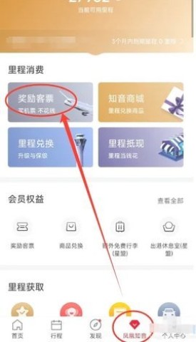 2. 轻点底部的【凤凰知音】图标,进入会员管理页面,接着在里程消费板块点击【奖励客票】,阅读《免票兑换公告》。