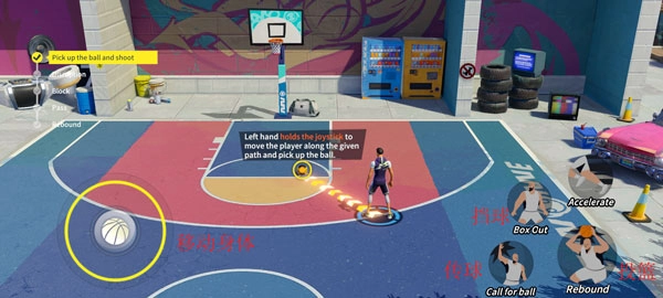 1、比赛界面内左下角可以移动角色,右下角有传球和投篮等动作。
