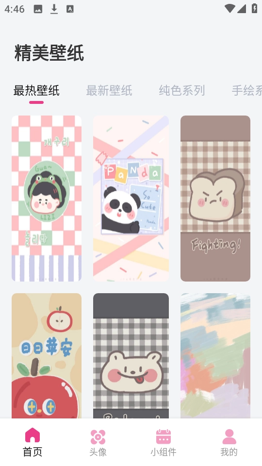2、首页设有热门壁纸、最新壁纸、纯色系列以及手绘系列等多个分类板块供用户浏览。