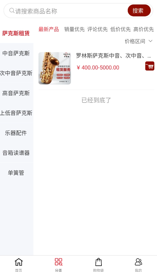 2、在分类页面浏览各类乐器商品,支持按购买或租赁需求筛选目标产品。
