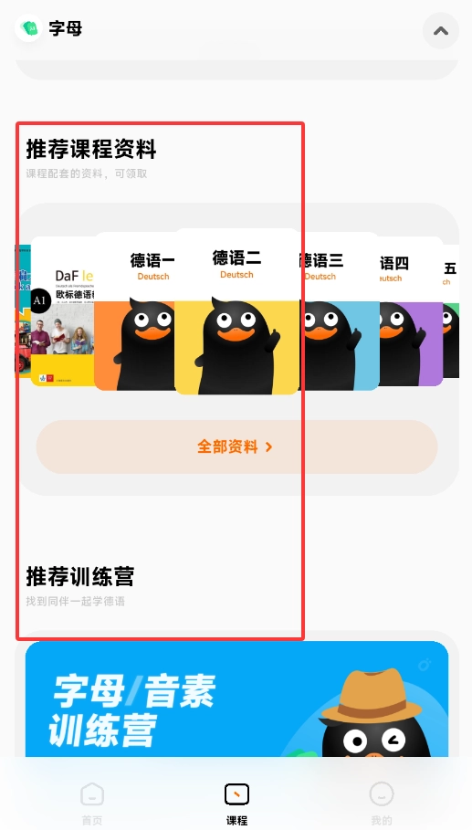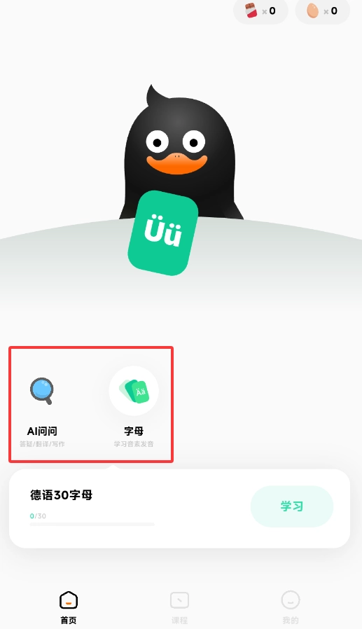 1、启动冲鸭德语后,首页提供AI智能问答和字母发音练习等基础功能。