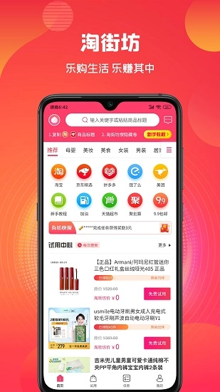 淘街坊致力于帮您达成“乐购生活,乐赚其中”的返利购物体验。平台每日0元送出10000件各类大牌商品,诚邀您免费试用。您只需每日完成专属任务,就能轻松领取现金红包,且支持即时提现。分享商品给好友,好友购买后双方均可获得佣金,助您实现轻松躺赚。