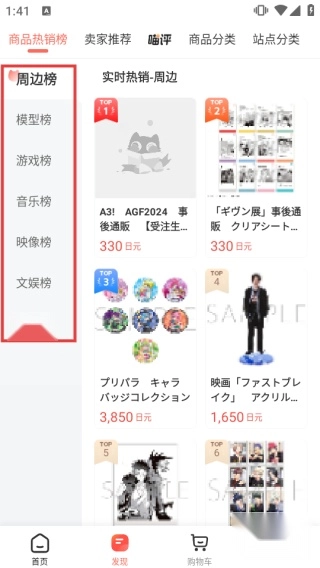 2、在【发现】页解锁各领域TOP榜,从周边到音乐,一键get圈内爆款清单。