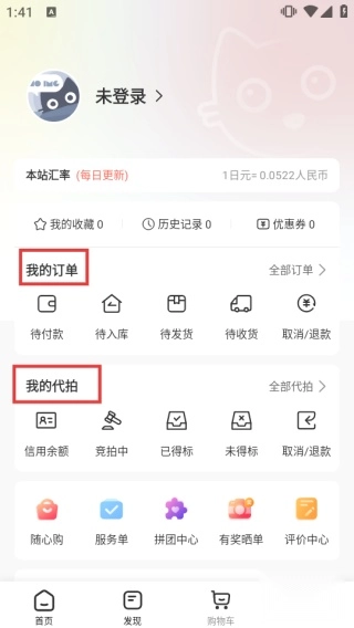 3、进入【我的】页面可随时追踪订单物流信息,代拍进度一手掌控,收藏夹内容也能随时查看。