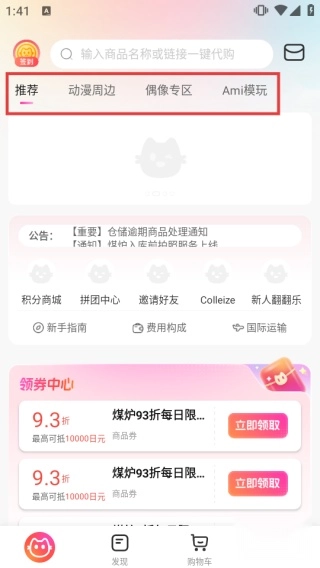 1、在首页顶部,你可以通过滑动来切换【推荐】【动漫周边】【偶像专区】【Ami模玩】等不同频道,轻松发现让你心动的好物。