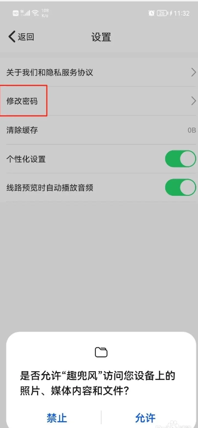 3、点击【修改密码】,并授权趣兜风访问您设备里的照片、媒体内容以及文件。