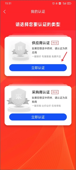 2、有两种认证类型可以选择,点击“供应商认证”。