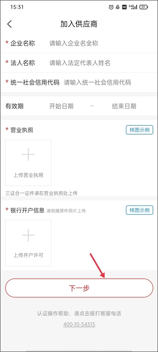 5、填写企业的基本信息和上传营业执照,点击下一步。