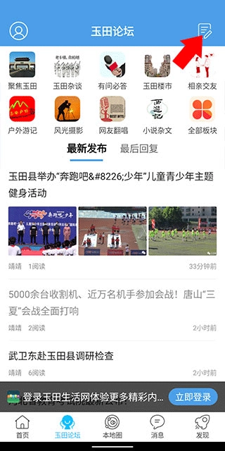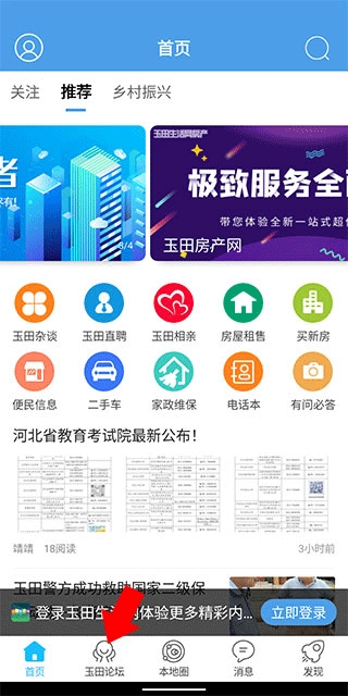 1、并打开玉田生活网,在首页中点击下方导航栏中的玉田论坛