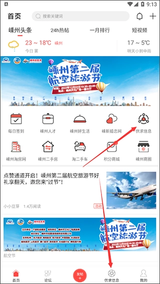 1、先打开我们的嵊州信息港平台,进入对应的软件后完成注册与登录操作,接着在首页找到并点击“供求信息”服务入口。
