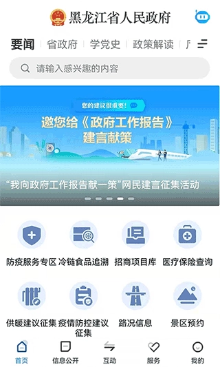 黑龙江省政府打造的这款政务服务平台功能十分强大,能为广大群众提供多项实用功能。在首页,用户就能看到政府要闻、政府要员信息、政府政策解读、政府部门各类公告以及全省资源报告等内容;进入信息公开栏目,群众可以查看政府信息,了解各类通知;在互动板块,用户能向政府提出意见;而服务栏目则为居民朋友们提供了便民服务与综合服务的办理渠道。这么实用的平台,有需要的话大家快来使用吧!