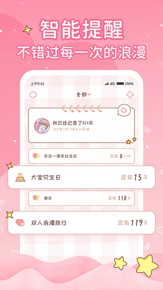 纪念日提醒包括:你和他的生日、恋爱纪念日,以及第一次约会、旅行记录等时刻的提醒。
