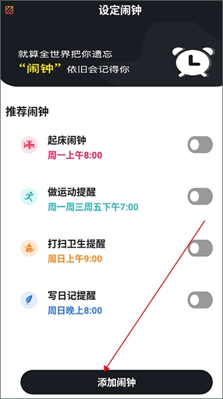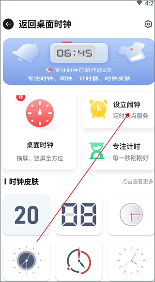 1、安装好专注时钟,打开软件主页面点击设置闹钟。