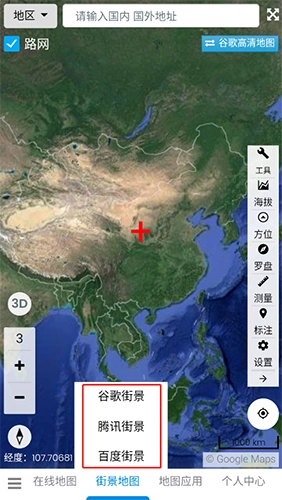 6、集成了谷歌街景,百度街景和腾讯街景,可以查看当地的真实图像。