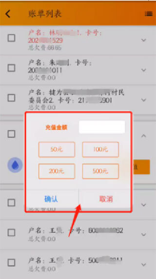 3、进入后,点击卡号,找到对应的充值按钮,在弹出的窗口里输入需缴费的金额,核对准确后,点击确认按钮。