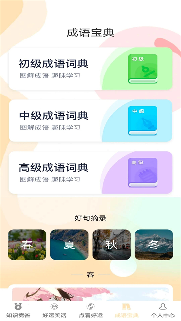 3、我们还能借助“成语宝典”去挑战初级、中级、高级三个不同难度的成语关卡,以此掌握更多新的成语。