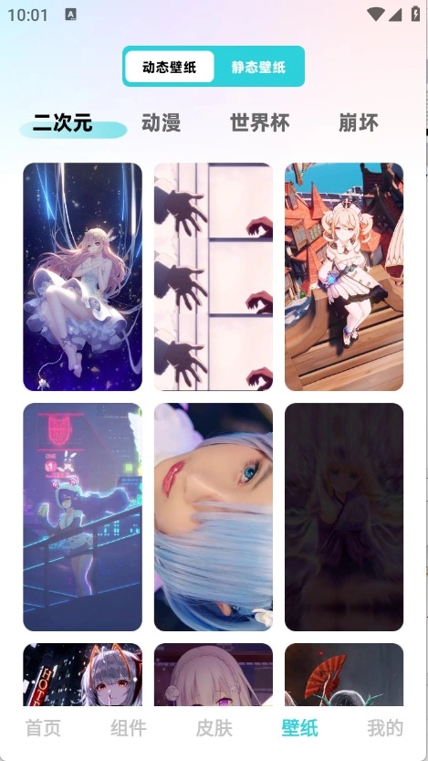 4、“壁纸”页面汇聚了丰富的壁纸资源,涵盖二次元、世界杯、动漫等多种类型。