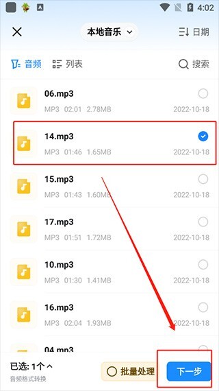 6、选择自己需要处理的音频,选择下一步。
